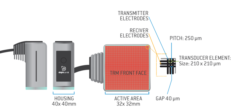 Dolphitech wykorzystuje unikalną architekturę matrycy 2D przetwornika (TRM) z 16 384 elementami i aktywną aperturą 32x32mm. Osiąga się to za pomocą 128 elektrod nadawczych, które są rozmieszczone nad 128 elektrodami odbiorczymi, tworzących oddzielny element o szerokości 0,25 mm na każdym przecięciu. Zapewnia to niezrównaną rozdzielczość, co w połączeniu z zakresem częstotliwości od 0,7 MHz do 10 MHz daje możliwość dokładnej kontroli szerokiej gamy materiałów.